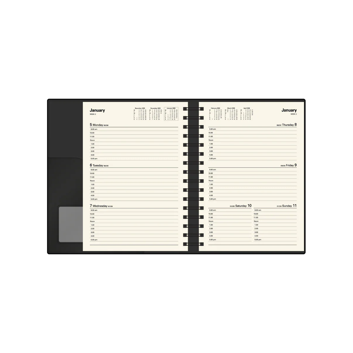 Its durability is assured with double wiro binding and heavy-grained metallic and matt PU cover. Printed on a subtle cream paper, each dated page layout features a six-month to opening calendar, week numbers, Julian days, as well as both national and international public holidays. This series comes with the added feature of an internal storage pocket in the desk diaries.